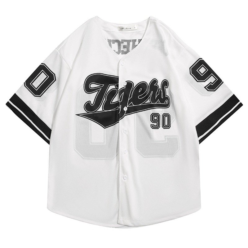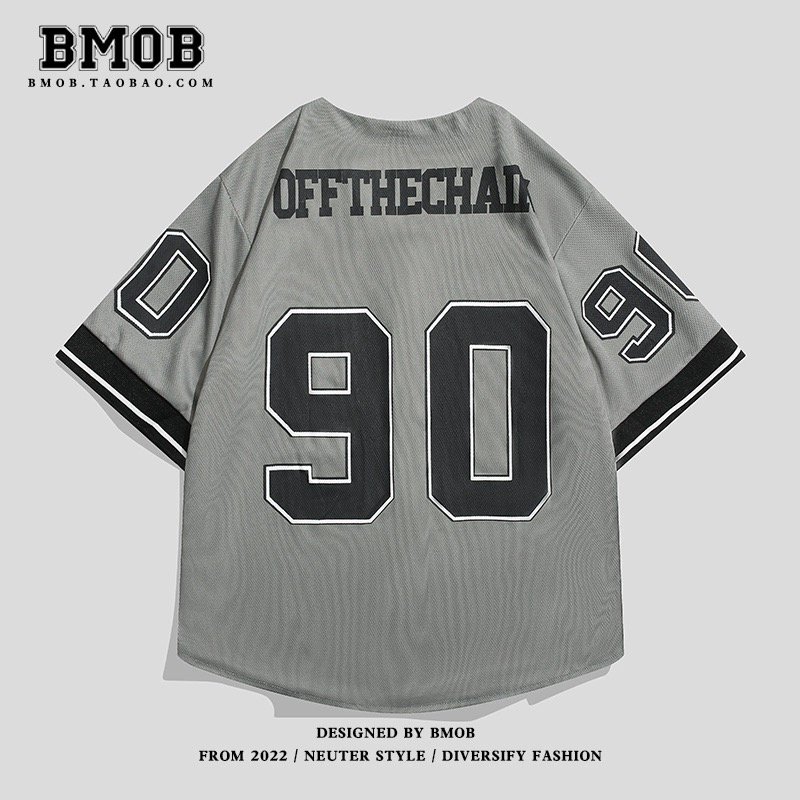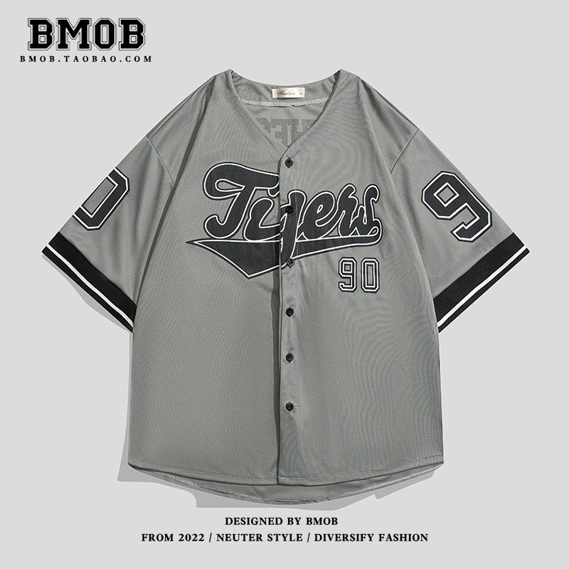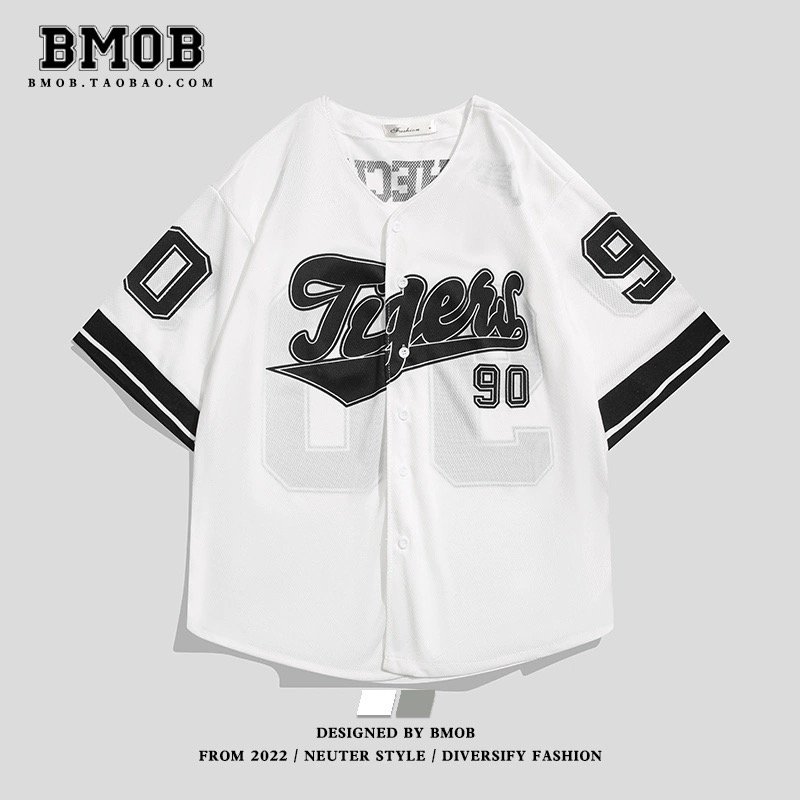 BMBO American high street retro hiphop cardigan short-sleeved T-shirt men’s street ins trend baseball uniform shirt top