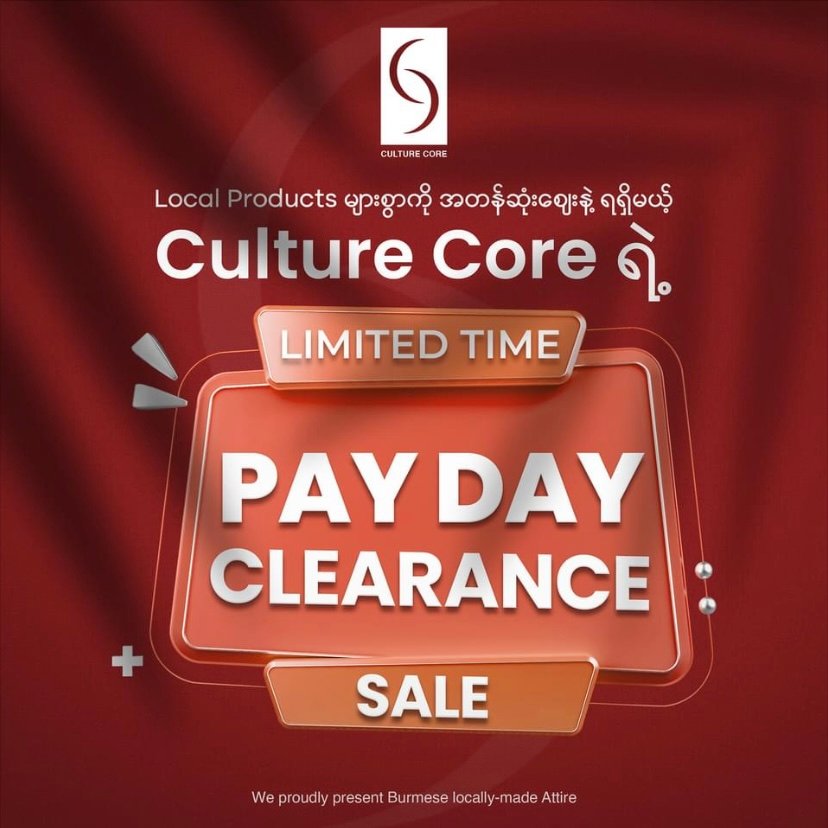 “Local Products များစွာကို အတန်ဆုံးဈေးနဲ့ ရရှိမယ့် 𝐂𝐮𝐥𝐭𝐮𝐫𝐞 𝐂𝐨𝐫𝐞 ရဲ့ 𝐏𝐚𝐲 𝐃𝐚𝐲 𝐂𝐥𝐞𝐚𝐫𝐚𝐧𝐜𝐞 𝐒𝐚𝐥𝐞”