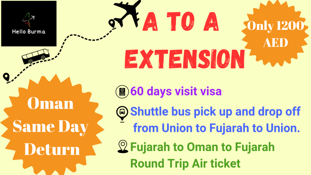 ဒီအစီစဥ်လေးဟာဆိုရင်တော့ UAE ရောက်မြန်မာလူမျိုးတွေအတွက် Hello Burma Travel & Tour နဲ့ BurmeseMarketplace.com တို့ပူးပေါင်းပြီး လူကြီးမင်းတို့အနေနဲ့ Visit Visa ကို တခါသက်တမ်းတိုးပြီးတိုင်း နောက်တခါအတွက် ပိုက်ဆံလုံးဝမကုန်ပဲ အခမဲ့တစ်ကြိမ်ထပ်မံသက်တမ်းတိုးနိုင်မယ့် အခွင့်ရေးပဲဖြစ်ပါတယ်😍