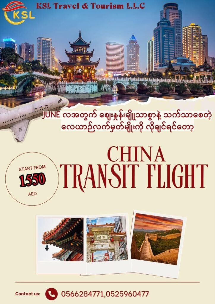 အဲ့ဒါဆိုရင်တော့ မင်မင်တို့ KSL Travel & Tourism L.L.C မှာ ရှိတဲ့ China Southern Airlines (Transit) နဲ့ မိတ်ဆက်ပေးပါရစေ.. Yangon to Guangzhou / Guangzhou to Dubai Transit flight ဖြစ်ပြီး စျေးနှုန်းကတော့ AED 1550 dhs မှစတင်၍ စျေးနှုန်းအစားစား ရရှိမှာဖြစ်ပါတယ်။