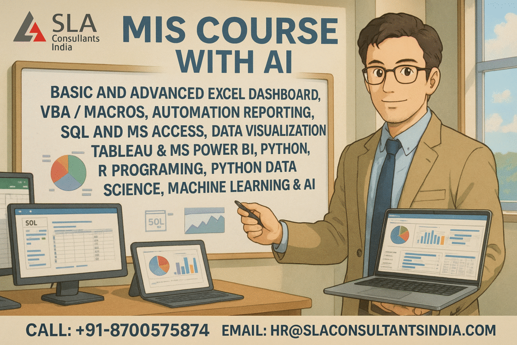 SLA Consultants India’s The Excel Automation and MIS Course: Complete MIS Internship is a career-transforming program designed to equip learners with advanced AI skills for 2026 and beyond. The course blends rigorous classroom and live-online training with a hands-on internship, providing real-world exposure to Excel automation, MIS reporting, data analysis, and AI-driven analytics. Participants master essential tools such as Advanced Excel, VBA Macros, MS Access, SQL, Tableau, Power BI, and Python, ensuring they are proficient in both traditional and cutting-edge analytics technologies.