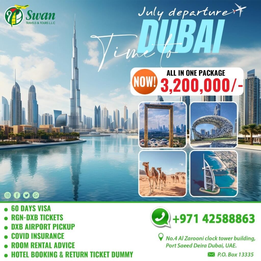 အခုလိုအချိန်အခါမှာ လေယာဉ်လက်မှတ်စျေးတွေ မြင့်တက်နေတာ၊ မြန်မာငွေစျေး ကျနေတာတွေကတော့ UAE ကို အရောက်လာပြီး အလုပ်အကိုင်ရှာဖွေချင်ကြတဲ့သူတွေအတွက် စိတ်မကောင်းစရာဆိုပေမယ့်၊ ကျွန်တော်တို့ Swan Travel & Tours LLC ကတော့ အားလုံးအတွက် အစဉ်အမြဲ အကောင်းမွန်ဆုံး ဝန်ဆောင်မှုပေးနေတာနဲ့အညီ … အပြီးအစီးမှ အပြီးအစီးဆိုပြီး တောင်းဆိုနေကြသူတွေကို All in One Package လေးတစ်ခု မိတ်ဆက်ပေးလိုက်ပါတယ်ခင်ဗျာ….